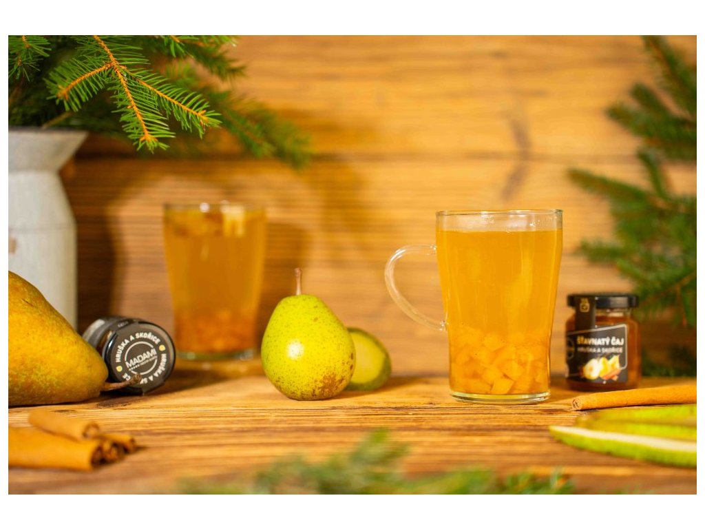 MADAMI Šťavnatý čaj Hruška a skořice je ovocný nápojový koncentrát s bohatě šťavnatou texturou, nazývaný také „pečený čaj". Sladká s jemně kořeněným nádechem – taková je chuťová kombinace hrušek se skořicí. Chuť hrušek je výrazně sladká, bohatá a komplexní, s náznaky květinových a někdy i dřevitých podtónů. Skořice ji doplňuje charakteristickou vůní připomínající zimní období a sváteční pokrmy.