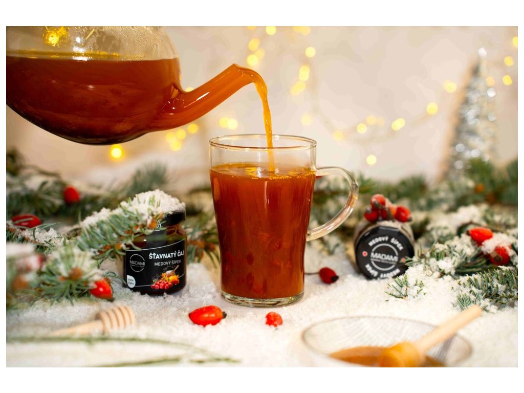 MADAMI Šťavnatý čaj Medový šípek je ovocný nápojový koncentrát s bohatě šťavnatou texturou, nazývaný také „pečený čaj". Kombinace šípku s medem je ztělesněním sladké zimní pohody. Šípek má jemně kyselou a ovocnou chuť s jemně bylinnými podtóny, jejichž přirozenou kyselost a mírnou trpkost nádherně vyváží bohatá, hřejivá sladkost včelího medu.