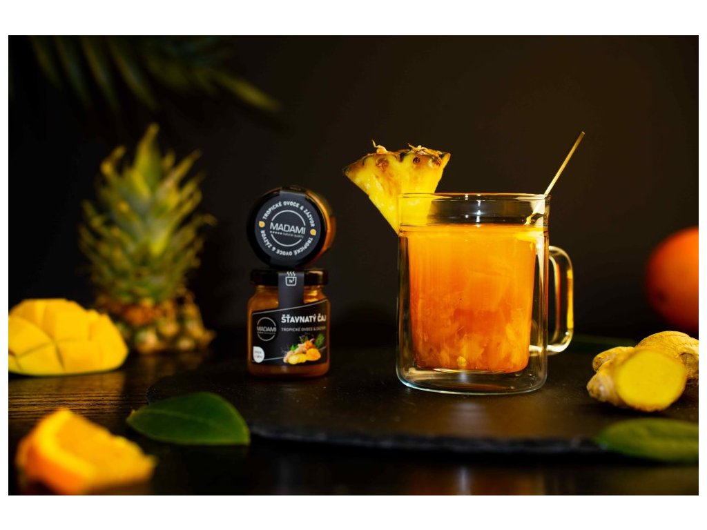MADAMI Šťavnatý čaj Tropické ovoce & Zázvor je ovocný nápojový koncentrát s bohatě šťavnatou texturou, nazývaný také „pečený čaj". Zázvor je esencí pikantní svěžesti a teplé kořeněné chuti – dokáže okamžitě zahřát tělo i duši. Citrusy a tropické ovoce přidají příjemnou svěžest a optimistickou chuťovou tečku. Ideální nápoj pro podzimní plískanice a mrazivé zimní dny.
