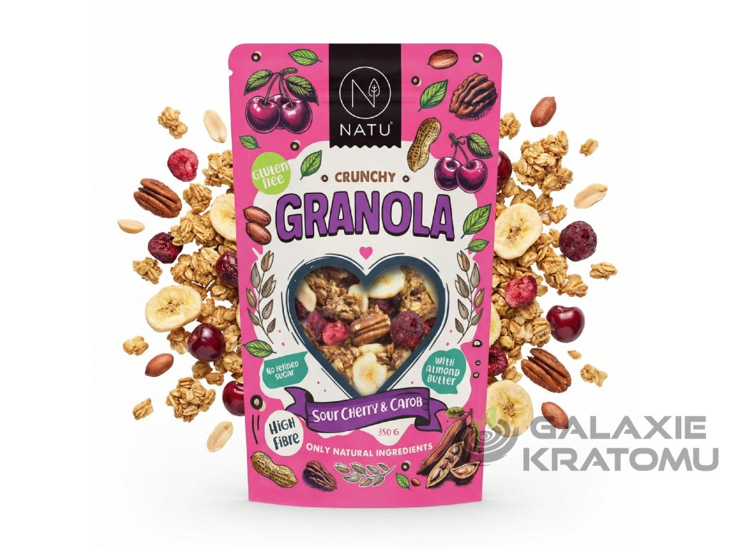 NATU Granola Višeň a karob 350 g spojuje příjemně kyselou chuť višní se sladkým banánem a kakaovo‑karamelovým nádechem karobu. Základ směsi tvoří bezlepkové ovesné vločky zapečené s mandlovým krémem, sušeným banánem, datlemi, pekanovými ořechy a kokosovým nektarem do velkých křupavých hrudek.