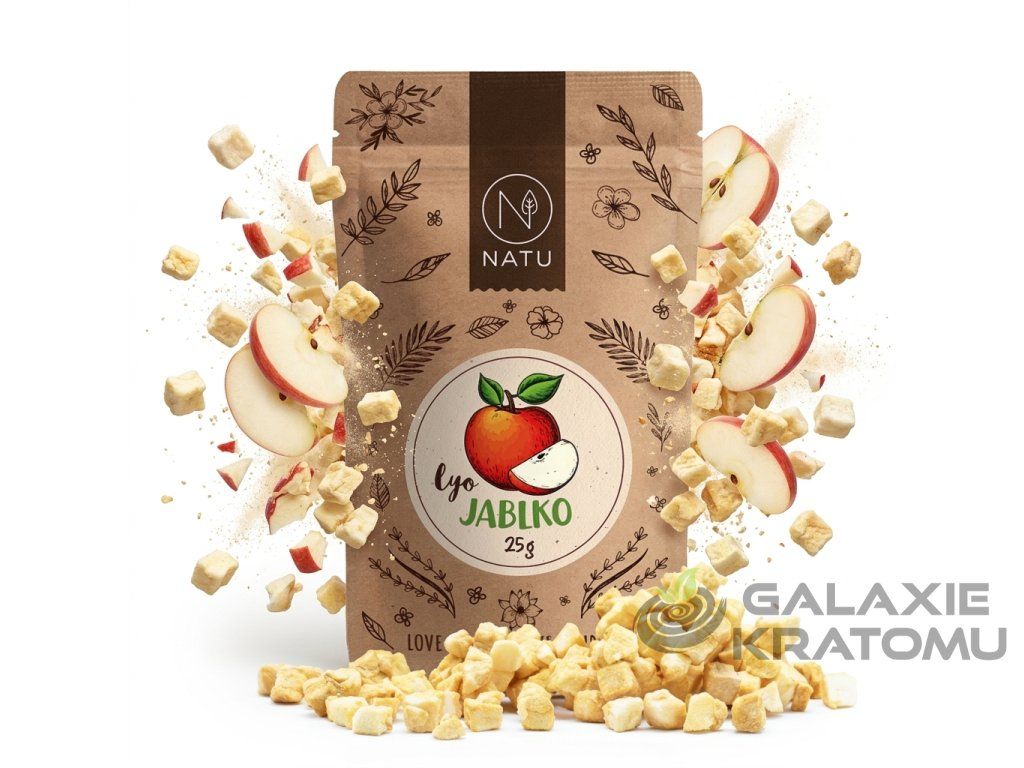 NATU Lyofilizované jablko 25g ti umožní vychutnat si chuť čerstvých jablek kdykoli a kdekoli – bez krájení, bez sušičky a bez kompromisů. Čerstvá jablka ze Slovinska jsou zbavena slupky i jádřinců, nakrájena na drobné kostičky a šetrně usušena metodou lyofilizace – sušení mrazem. Díky tomu si zachovávají svůj původní vzhled, intenzivní sladko-kyselou chuť, vůni a vysoký obsah prospěšných látek, přičemž mají zároveň mnohem delší trvanlivost než čerstvé ovoce.