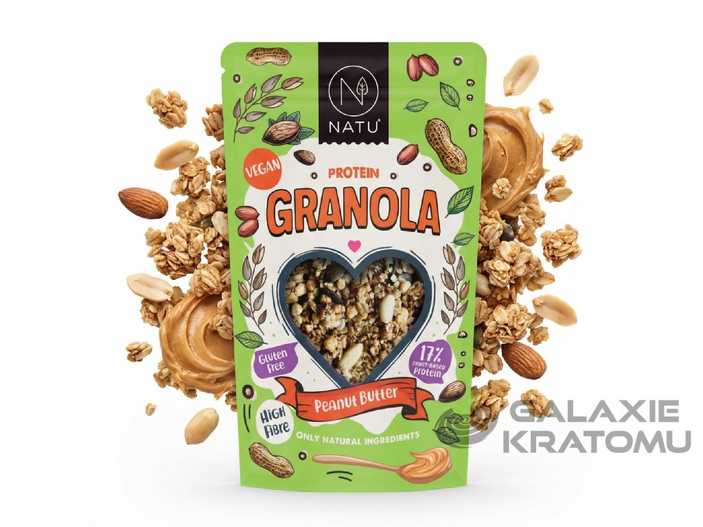 NATU Protein Granola s arašídovým máslem 280 g je navržená jako výživná snídaně pro ty, kteří chtějí spojit poctivou granolu s vyšším obsahem rostlinných bílkovin. Základ tvoří bezlepkové ovesné vločky, arašídový krém, loupané mandle, arašídy a pořádná dávka semínek, doplněná o vysokoproteinové hrachové křupinky.