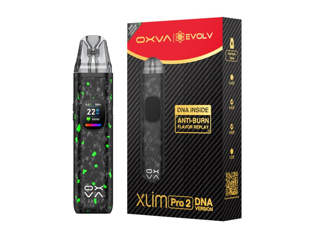 OXVA Xlim Pro 2 DNA Pod Kit (Luminous Forged Carbon Fiber) je špičkový pod systém od OXVA, kombinující legendární čip Evolv DNA, baterii 1300mAh, HD displej a boční regulaci airflow.
