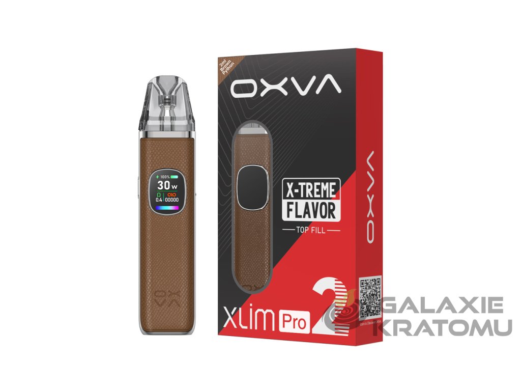 OXVA Xlim Pro 2 Pod Kit v originálním hadím provedení Brown Python přináší druhou generaci populární série Xlim Pro a nabízí více výkonu, vyšší kapacitu baterie, rychlejší nabíjení a strhující HD displej s přehledným uživatelským rozhraním a animacemi během vapování. Integrovaná baterie o kapacitě 1300 mAh je navržena pro intenzivní celodenní používání a ve spojení s regulovatelným výkonem v rozsahu 5–30 W umožňuje přesné doladění chování e‑cigarety jak pro klasické MTL šlukování, tak utaženější RDL potah.