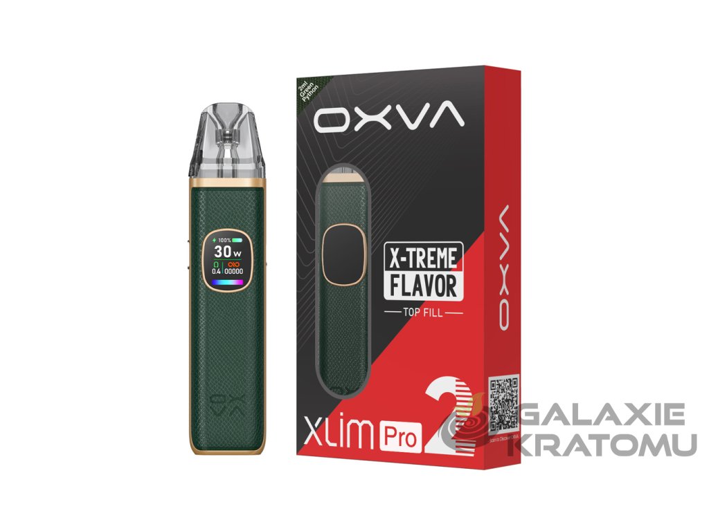 OXVA Xlim Pro 2 Pod Kit v hadím provedení Green Python reprezentuje druhou generaci oblíbené řady Xlim Pro a přináší upgrade ve všech směrech – větší kapacitu baterie, rychlejší nabíjení, HD displej a vyladěné uživatelské rozhraní s animacemi při potahu.