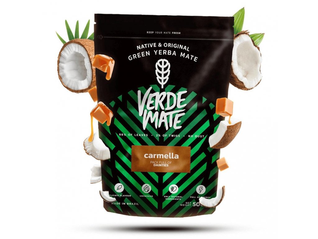 Verde Mate Green Carmella je brazilská yerba maté s příchutí..... karamelu! Základem složení je cesmína paraguayská pocházející z výsadby v lesích státu Paraná. Po sklizni je sušina podrobena procesu pražení, díky němuž výrobek vyniká jedinečným, jemně kakaovým aroma. V kombinaci s kokosovými lupínky a přírodním karamelovým aroma je výsledkem skvělý, hřejivý nápoj připomínající horkou čokoládu nebo kávu.